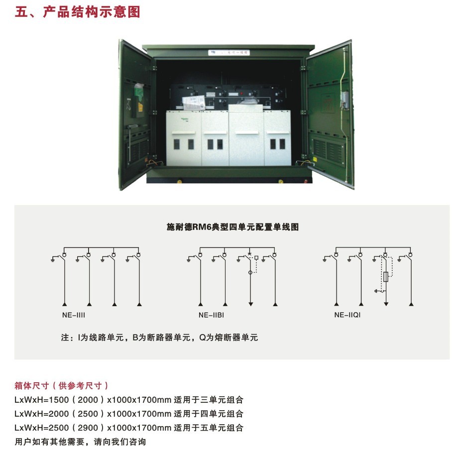 >開關可采用施耐德RM6系列,ABB SFG型三工位SFe負荷開關,ABB共箱式Safe系列,西門子8DJ20等開關,可根據用戶需求選配開關類型。